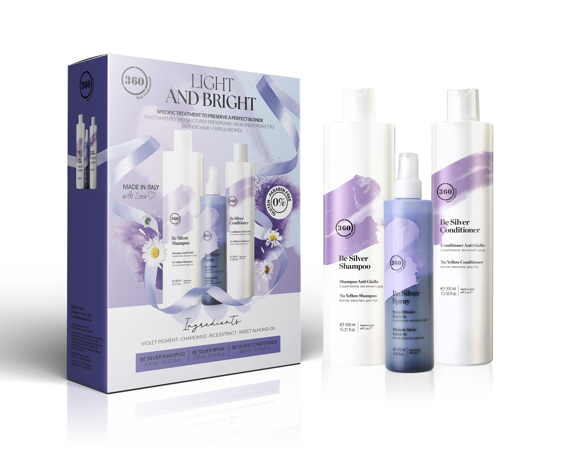 Light and Bright è il trattamento specifico per il mantenimento del biondo perfetto. Arricchito con pigmenti viola, elimina i riflessi gialli ed esalta la luminosità dei capelli biondi, decolorati, grigi e con meches.